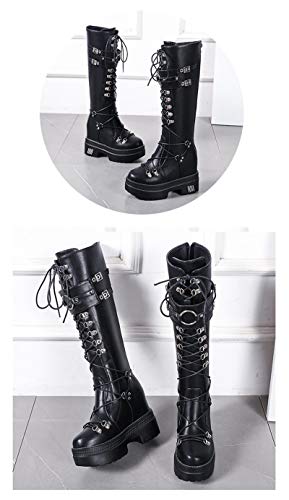 Stivale al Ginocchio di Pelle Stringati i con Plateau con Tacco Alto A metà Polpaccio Stivali Retro Biker Anfibi Stivaletti Alti,Nero,37 EU