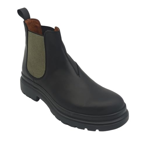 FRAU, Stivaletto Casual Uomo In Pelle Nera Effetto Vintage, Con Elastico Bilaterale Verde Militare e Pull Up sul Retro, Altezza Gambale 12 cm, Suola Carrarmato in Gomma, 45, Made in Italy