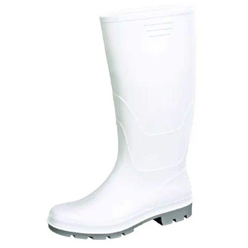 Stivali da uomo in PVC, di colore bianco, studiati e realizzati per l'utilizzo nel settore alimentare. Sono marchiati CE e rispondono alla norma EN 347 riguardante le scarpe antinfortunistiche ad uso professionale leggere, senza puntale di protezione. Caratteristiche che li contraddistinguono sono l'altezza al ginocchio, la suola antiscivolo, sempre in colore bianco e dotata di carrarmato che li rende stabili e asciutti in presenza di acqua o pavimenti bagnati, la morbidezza della gomma e il design essenziale. Pratiche e facilmente lavabili, sia all'interno che all'esterno. Stivali di acqua in PVC Colore: Bianco Taglia: 43