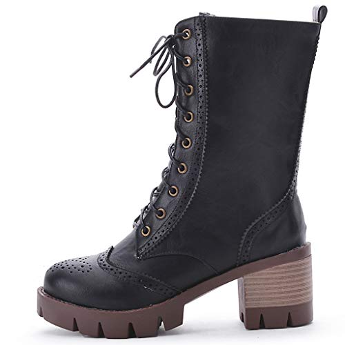 Stivali Donna Moda Colore Puro Punta Tonda Stivali Stringati Tacchi Quadrati Vintage (42,Nero)
