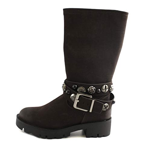 Stivali al Polpaccio Donna Cafe'Noir in camoscio Marrone Testa di Moro con Punta a Effetto Consumato e Cinturino con Applicazioni in Acciaio. N.37