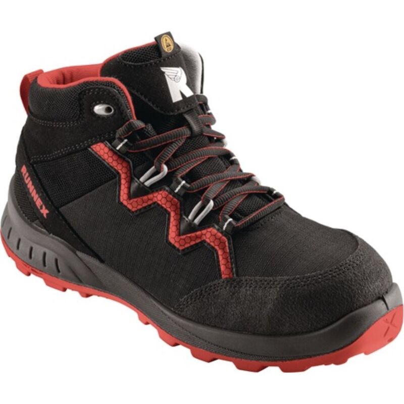 Secondo DIN EN ISO 20345:211 / EN 61340-4-3:2001 · S3 SRC ESD · Tomaia: materiale in microfibra idrofoba, materiale tessile idrofobo · RUNNEX® Overcap di protezione in alluminio · soletta traspirante e a tutta superficie per la sostituzione in Poliyou® · RUNNEX® Mandrino funzionale SPORTY · Suola in PU (rossa), con intersuola in PU (nero), resistente all'olio e al carburante, resistente al calore fino a circa 130°C, senza sfarinamento · Larghezza 11 · Focus di applicazione: Le scarpe antinfortunistiche garantiscono elevato comfort, massima stabilità e protezione contro le cadute dovute allo scivolamento. Possono essere utilizzati universalmente, e.B. nell'industria, nel commercio, nelle postazioni di lavoro ESD, nelle aree interne Altre proprietà tecniche: · Tappo: Alluminio · Intersuola: PU · Norma: EN ISO 20345. Colore: nero/rosso, Taglia: 44, Numero di scarpe: 11, Classe di protezione: S3 SRC ESD, Serie: TeamStar, Materiale: Microfibra/tessuto, Marca: RUNNEX, Categoria DPI: II.