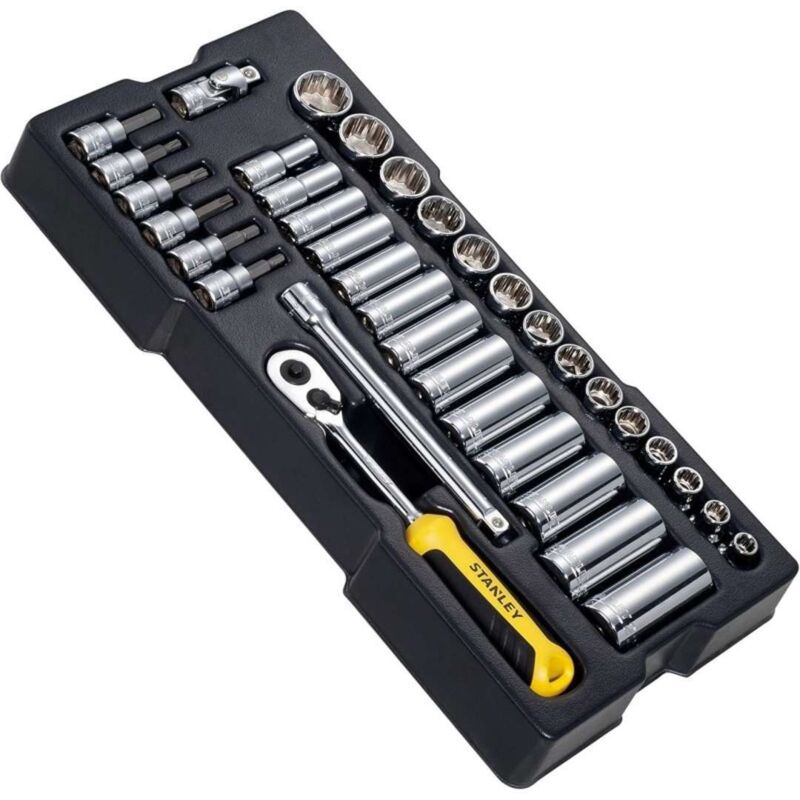 Descrizione - Cricchetto: Bloccaggio di sicurezza delle bussole, leva del senso di rotazione con indicatore, acciaio al cromo-vanadio, impugnatura bimateriale resistente agli agenti chimici - Bussole: Sistema Maxi Drive che riduce l'usura delle viti