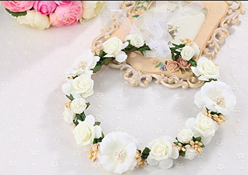 Stofirst Moda Donne Ragazze Boemo Fatto a Mano Artificiale Rose Corona Ghirlanda Intrecciato Floreale Catena Festival Partito Nozze Copricapo Cerchietti Fascia Accessori con Nastro di Raso(Bianca)