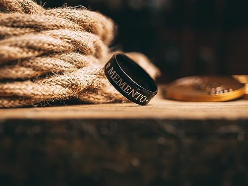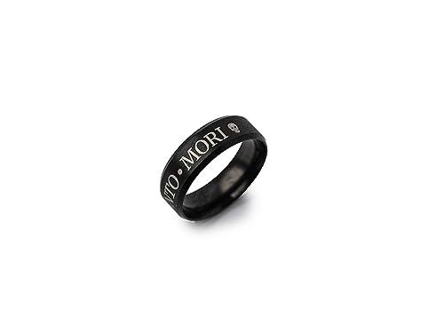 Acciaio inossidabile: l'anello è realizzato in acciaio inossidabile e presenta un rivestimento nero. I bordi sono di colore più lucido, mentre la fascia centrale dell'anello è nera opaca. È qui che le parole "Memento Mori" e teschi sono state incise al laser.