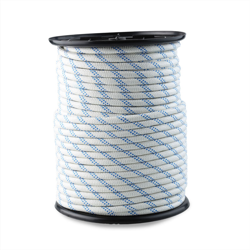 Corda in poliestere intrecciato. Carico di rottura: 1750 kg circa. Finitura bianca e blu. Per nautica, sport, industria. Trattamento speciale anti-UV.