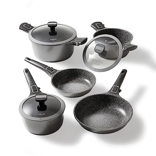 STONELINE Imagination PLUS Batteria Pentole e Padelle 8 Pezzi 18/20/24 cm, Coperchi, Manico Removibile, Rivestimento Antiaderente con Vere Particelle di Pietra, a Induzione, Tutti i Piani Cottura