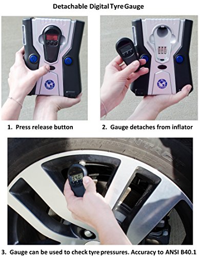 SEMPLICE DA USARE - Il manometro digitale può essere facilmente rimosso e utilizzato separatamente per verificare la pressione. L'apparecchio gonfia rapidamente le gomme di una vettura di medie dimensioni: da sgonfie a 2 bar in 4 minuti;
