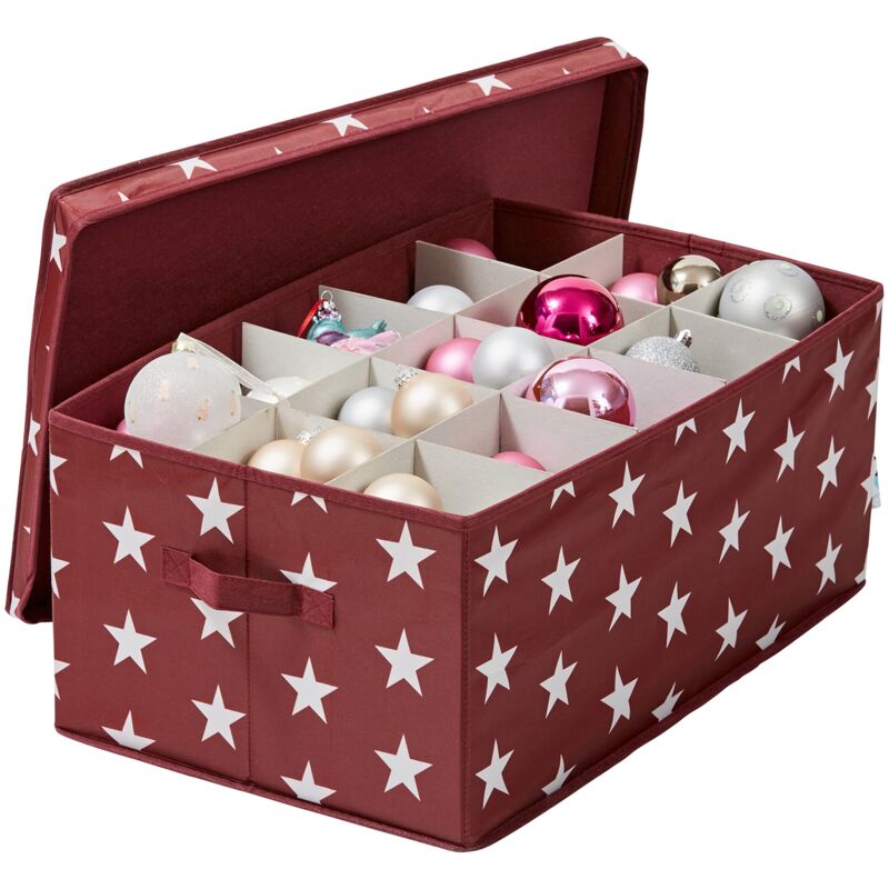 Scatola di conservazione per palline di Natale . La scatola di stoccaggio per palline e decorazioni dell'albero di Natale offre 30 scomparti su due livelli per riporre palline dell'albero di Natale, luci di fata e altre decorazioni. Misurando 56 x 36 x 25cm, la scatola di gingilli di Natale offre un ampio spazio per le vostre decorazioni natalizie. I divisori inferiori della scatola di stoccaggio possono essere regolati individualmente in modo che palline e luci di fata trovino spazio. La scatola di stoccaggio è dotata di una stampa a stelle integrale che si abbina al periodo natalizio. Il coperchio della scatola di stoccaggio è fatto di poliestere resistente agli strappi. Ulteriori maniglie sono attaccate ad entrambi i lati. I divisori inferiori della scatola di stoccaggio sono fatti di cartone robusto.