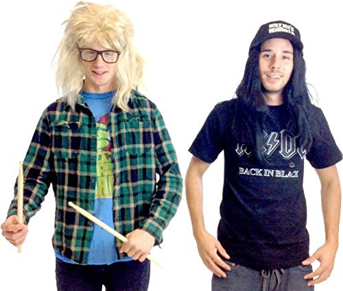 Include parrucca nera, parrucca bionda, cappello Wayne, bacchette per batteria e lenti.