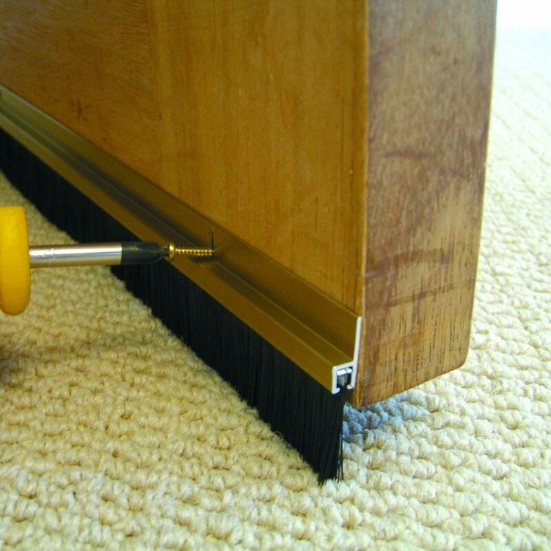Attacco: 1. Con porta chiusa, misurare la larghezza inferiore della porta. 2. Far scorrere la spazzola dal supporto/alloggiamento e tagliare il supporto/alloggiamento a misura. 3. Utilizzando un pennello per seghetto - tagliare attraverso una piccola asta di metallo (solo 3 mm di larghezza) tenendo il pennello in posizione. Suggerimento. Spazzola a crimpare alloggiamento in metallo con pinze per evitare che i pennelli cadano. spremere le estremità con le pinze in modo che siano compresse. 4. Offrire la guarnizione della porta contro la porta, quindi la parte inferiore della spazzola si trova appena sopra la superficie del pavimento e lo spazio di chiusura tra la porta inferiore e il pavimento, e segnare dove appaiono i fori contro la porta con la matita. Suggerimento. Praticare fori pilota per viti in modo che le viti possano essere avvitate senza danneggiare la testa della vite. 5. Avvitare saldamente alla base della porta. 6. Regolare se necessario per una perfetta vestibilità, i