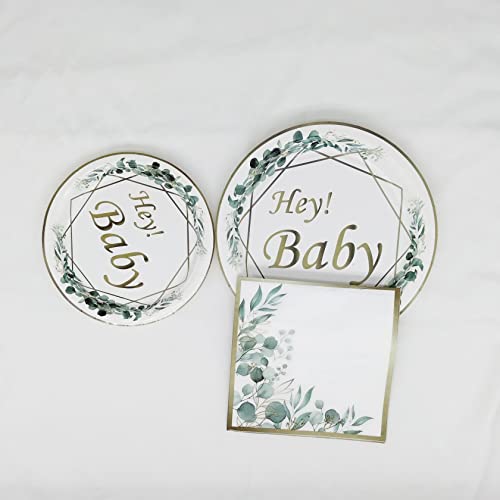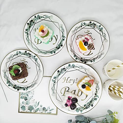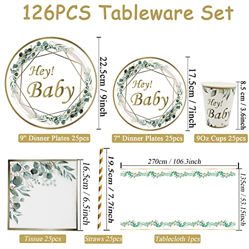 Stoviglie per baby shower: la confezione contiene 25 piatti da 9 pollici, 25 piatti da 7 pollici, 25 bicchieri da 9 oz, 25 tovaglioli, 25 cannucce. 1 tovaglia decorativa per baby shower, colore verde salvia. Questo set di piatti decorativi per baby shower offre spazio per 25 persone.