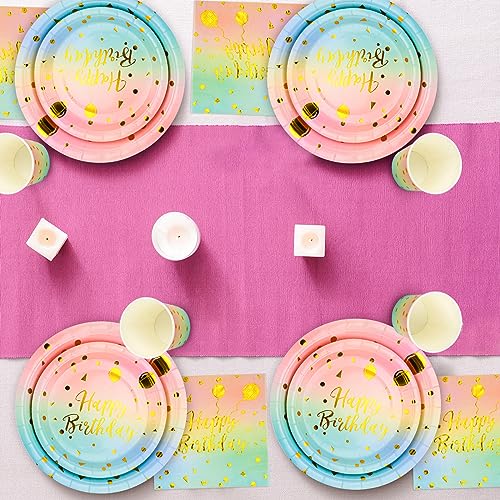 ❤【Design a tema buon compleanno】I nostri piatti e tovaglioli di carta sono caratterizzati da uno sfondo morbido e sfumato e da motivi dorati di buon compleanno in bellissimi colori, che renderanno la vostra festa unica e vivace.
