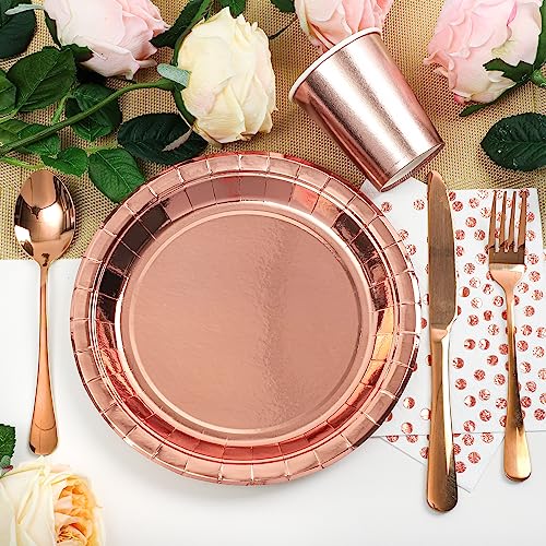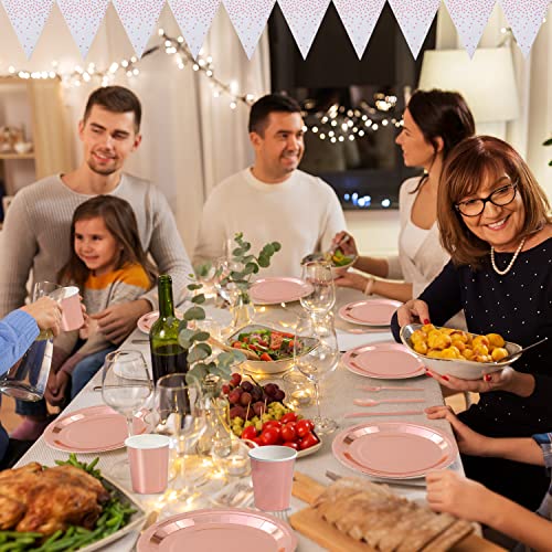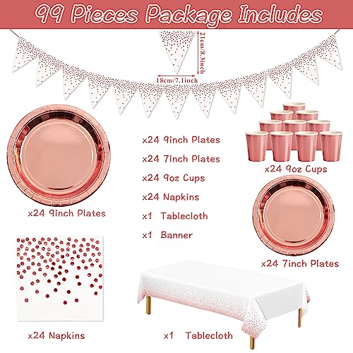 Oro Rosa Stoviglie per Feste 99 Pezzi Rose Golden Dot Stoviglie Party Piatti di Carta, Tovaglioli, Tazze 9oz, Tovaglia, Banner, per Compleanno Anniversario Fidanzamento Matrimonio Laurea (24 Ospiti)