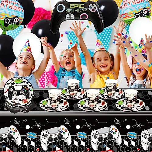 Stoviglie per Feste Videogiochi,Doyomtoy 76 Pezzi Decorazioni per Feste di Compleanno Gioco Palloncini Piatti di Compleanno Tazze Tovaglioli Tovaglie per Bambini Compleanno Decorazioni