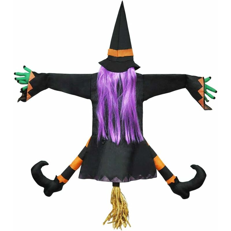 DECORAZIONE ALBERO DI HALLOWEEN: la decorazione della strega di Halloween da 101 cm è l'aggiunta perfetta alla tua casa per divertire i tuoi amici, vicini e ospiti Leggero e resistente: il materiale in nylon imbottito leggero ma resistente è facile da montare, trasportare e riutilizzare. FACILE COSTRUZIONE: con il anello di attività, questo accessorio è facile da attaccare a diversi tronchi d'albero o pilastri di diverse forme e dimensioni Design vivace e divertente: con capelli viola lucidi, mani verdi e calze colorate, questo accessorio ha l'aria vibrante. Il manico di scopa che cade e le braccia e le gambe aperte mostrano che è bloccata nell'albero, il che rende l'intera scena divertente.DIMENSIONI: la strega che cade (compresa la scopa) è alta circa 101 cm x 91 cm di larghezza