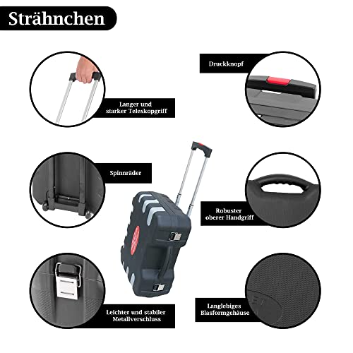 Cassetta degli attrezzi portatile in plastica dura: questa cassetta degli attrezzi è facile da trasportare, poiché il set di chiavi a bussola di Strend Pro viene fornito in una valigetta in plastica rigida nera e argento perfettamente abbinata con manico telescopico, 2 ruote, serrature in metallo e robusta maniglia superiore. Così tutti gli strumenti sono sempre a portata di mano e organizzati in modo pratico