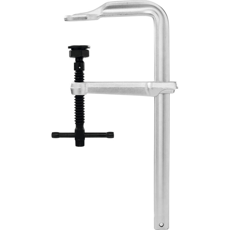Guida e arco fisso in acciaio lucido trafilato (profilato speciale), bonificato e zincato galvanicamente. Arco scorrevole in acciaio forgiato, bonificato e zincato galvanicamente. Mandrino scorrevole in acciaio e resistente all'usura con filettatura trapezoidale. Lunga durata grazie allo speciale piattello di pressione resistente al calore con inserto in acciaio sinterizzato, orientabile fino a 35°. Asta filettata bonificata e brunita con galletto regolabile. Uso: Per sollecitazioni elevate nel serraggio di pezzi in carpenteria, officine di fabbri, costruzioni di autocarri, ingegneria meccanica, ecc. Il cappuccio a pressione speciale orientabile consente il serraggio di pezzi inclinati fino a 35°. Pressione di serraggio massima fino a ca. 12000 N. Dati tecnici Tipo di prodotto Strettoio Profondità arco, mm 140 Apertura, mm 1.500 Sezione trasversale della guida, mm 30×15 Peso, kg 6,7