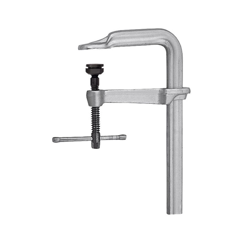 Guida e arco fisso in acciaio lucido trafilato (profilato speciale), bonificato e zincato galvanicamente. Arco scorrevole in acciaio forgiato, bonificato e zincato galvanicamente. Mandrino scorrevole in acciaio e resistente all'usura con filettatura trapezoidale. Lunga durata grazie allo speciale piattello di pressione resistente al calore con inserto in acciaio sinterizzato. Asta filettata bonificata e brunita con galletto regolabile. Orientabile fino a 35°. Uso: Per sollecitazioni elevate nel serraggio di pezzi in carpenteria, officine di fabbri, costruzioni di autocarri, ingegneria meccanica, ecc. Il cappuccio a pressione speciale orientabile consente il serraggio di pezzi inclinati. Pressione di serraggio massima fino a ca. 22000 N. Dati tecnici Tipo di prodotto Strettoio Profondità arco, mm 175 Apertura, mm 600 Sezione trasversale della guida, mm 40×20 Peso, kg 7,2