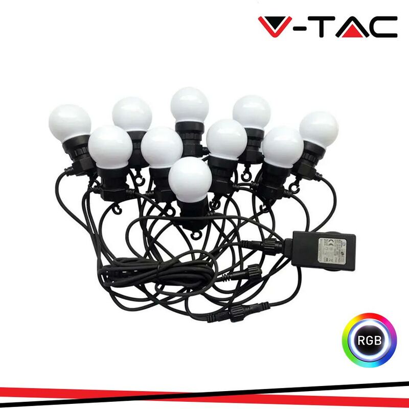 LED String Light 5m. 10 x 0.5W EU Lampadine RGBY SKU: 7435: VT: VT-70510 Caratteristiche del prodotto Corona leggera per 10 x 0.5W lampadine EU Plug - installazione facile Conettori resistenti allumidità e cavo in gomma per uso esterno Facile collegamento, 5 metri in totale IP44 Installazione Ideale per linstallazione in edifici, bar, sport, ecc. Specifiche tecniche Informazione generale Dati elettrici Potenza 5W Tensione di ingresso AC 100-240V Frequenza 50/60 Hz Fattore di potenza 50/60 Hz Dati tecnici luce Fascio Luminoso° 270° Colore della luce RGBY Flusso luminoso (lm) 300 lm Indice di resa cromatica Ra >80 Dettagli corpo Tipo String Light con 10 pezzi di lampadine Materiale Cavo di gomma, lampadina di plastica Funzionalità IP Protezione IP44 Tempo innesco 100% 0.001 secondo Stabilità del colore Intensità luminosa, Cd 27.9 Cd Max. Numero cicli accensione / spegnimento >15000 Condizioni di lavoro Non adatto per luso in condizioni estreme. Condizioni normali di lavoro tra -20 °