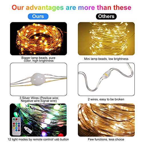 ☀【GRANDI PERLINE DELLA LAMPADA, FORTE LUMINOSITÀ, DESIGN A 3 LINEE】Rispetto ad altre luci stringa LED, le nostre perle della lampada sono più grandi e il colore è bianco puro, quindi le luci colorate in filo di rame saranno più luminose e più vivide quando la luce è intensa. Catene luminose sono costituite da 3 fili di alta qualità: filo positivo, filo negativo e filo di segnale. Solido e impermeabile