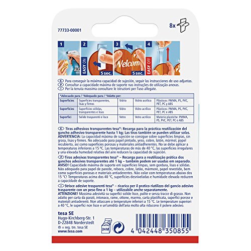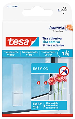 Tesa Strisce Adesive per Trasparenti e Vetro, Ricariche adesive per gancio biadesivo trasparente tesa, Per vetri, specchi o plastica, 8 Pezzi, Tenuta fino a 1,0 kg