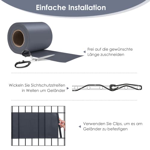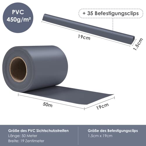 Pratico: dimensioni: 50 m × 19 cm, peso al metro: 450 g/m², accessori inclusi: 35 clip di fissaggio. Colore: grigio scuro. Il materiale anti-ultravioletto assicura che la striscia frangivista non solo protegge efficacemente la privacy, ma assorbe anche alcuni raggi ultravioletti in modo efficace proteggendo la pelle.