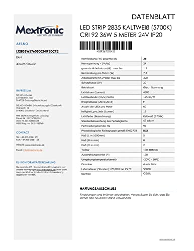 Striscia di 2835 LED bianco freddo (5700K) CRI 92 36W 5m 24V IP20