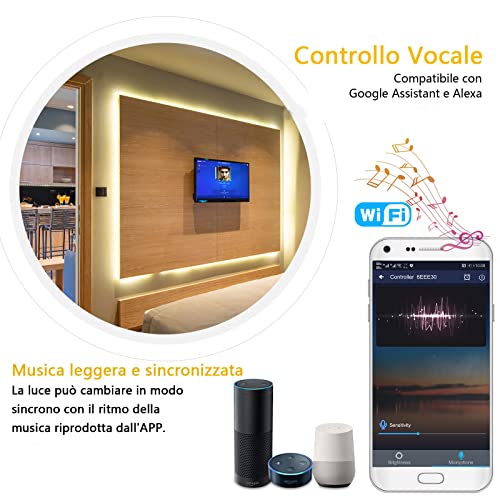 【Compatibile con Google Assistant/Alexa】La striscia luminosa è compatibile con Google Assistant/Alexa,quando ti trovi in un ambiente WIFI (modalità 2,4 GHz),aggiungi dispositivi intelligenti tramite l'APP del telefono cellulare,realizza il controllo vocale e libera le mani in qualsiasi momento, ovunque.Puoi anche controllare la barra luminosa dal tuo telefono
