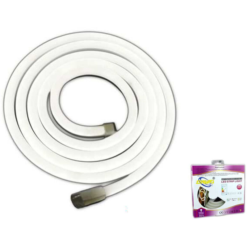 Striscia LED flessibile da due metri, impermeabile e quindi adatta sia per esterno che per interno. Utile per creare decorazioni come scritte, disegni ecc. Usato nei più svariati campi come casa, ufficio, e anche auto e moto MAGGIORI INFORMAZIONI Caratteristiche principali: Lunghezza: 200 cm Tagliabile ogni 50 cm Alimentazione: 12V Colore luce: Fredda Angolo illuminazione: 120° IP65