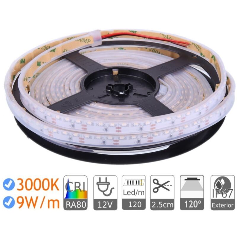 LED LED TIRA 12V 3000K ESTERNO 9W/M Striscia a LED con luce di illuminazione laterale esterna. DC 12v Qualico White 3000K. Potenza 9 W per metro. La striscia a LED è fornita in bobina da 5 metri, il prezzo mostrato è per 5 metri illuminazione laterale - posizione orizzontale Questa striscia LED laterale trasporta un tipo di LED che invece di illuminare lo stesso piano orizzontale del PCB, si illumina a 90o. Cioè, se si mette la striscia a LED su un tavolo, invece di illuminare, si accenderà a un lato. Da un lato, questo consentirà, ad esempio, a posizionare la luce nel perimetro di una finestra e che i LED si alumi sul davanti anziché su, giù, sinistra e destra. Quando i piani orizzontali circondano i LED per dare la loro luce verso l'alto, anziché sul lato. illuminazione in piccoli spazi - posizione verticale D'altra parte, è possibile posizionarlo in posizione verticale occupando solo uno spazio di spessore 4,2 mm, meno di qualsiasi Striscia a LED IP65 di mercato convenzionale. 12V