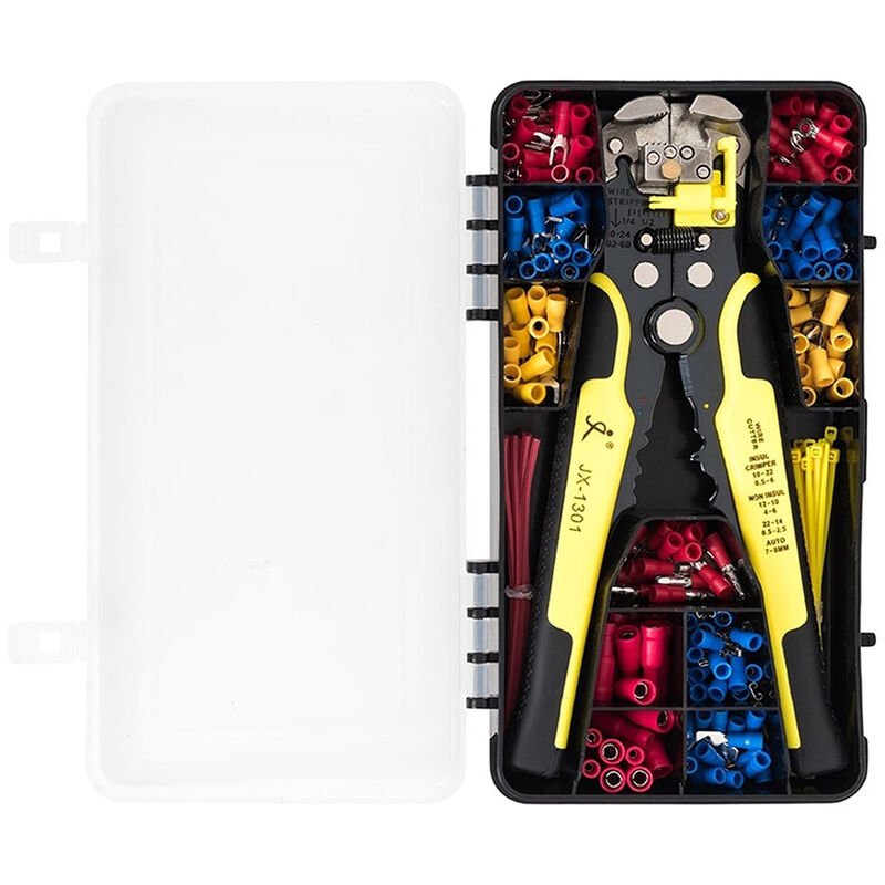 una robusta scatola di plastica li conserva tutti bene, ordinati e ordinati, facili da trasportare. spelafili multifunzionale, uno strumento piccolo ed efficiente, combina la funzione di spelafili, cesoia e crimpatrice, estremamente popolare tra elettricisti, appassionati di fai da te. Specifiche: Materiale spelafili: acciaio Materiale terminale: nylon + rame spelafili Colore: Giallo Intervallo di spelatura: AWG 24-10 (0,25-0,6 mm2) Intervallo di crimpatura: Isolato: AWG 22-10 (0,5-6 mm2) Non isolato: AWG 12-10 (4-6 mm2)
