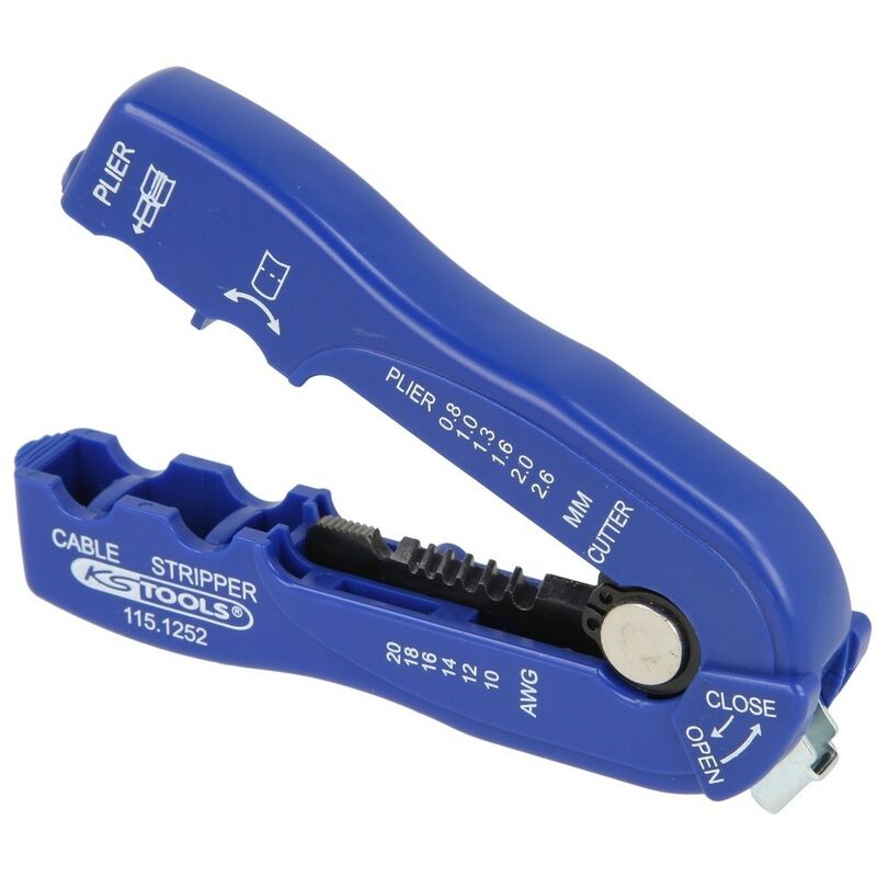Morsetto di denuder universale con 5 funzioni: tagliare forme tonde e lunghe, evaporare, tagliare e mantenere i fili. Adatto per tagli circolari e tagli longitudinali dei cavi rotondi del mercato e per la denuudazione di conduttori flessibili e solidi. Inoltre, il morsetto ha una funzione di cavo e morsetto e può essere conservato in sicurezza in ogni tasca grazie alla chiusura di sicurezza. Specifiche tecniche:0.8-1,3- 1,3-1,6- 2,0-2,6 mm2