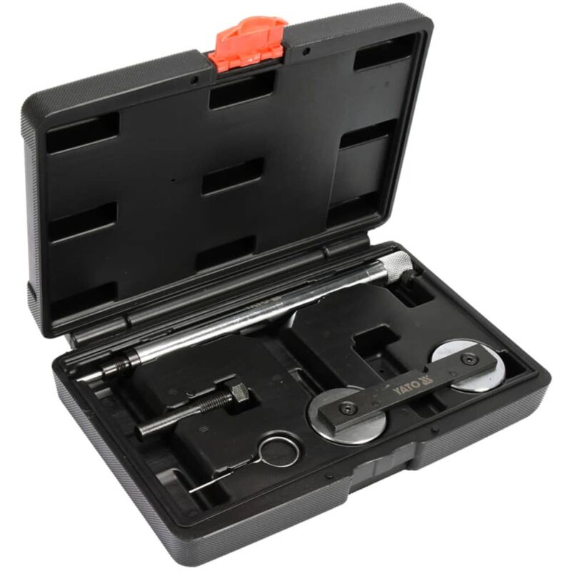 Il kit di strumenti YATO per la fasatura dei motori benzina è ideato per regolare l'albero a camme dei motori benzina e consiste in 4 pezzi fatti di acciaio al carbonio. Questo kit di 4 pezzi pressionale è stato specificatamente sviluppato per gestire la distribuzione dei motori FSI e TFSI delle automobili della famiglia VAG. L'equipaggiamento di base consiste in 1 strumento per determinare il TDC (punto morto superiore), 1 strumento per il bloccaggio dell'albero, 1 mandrino e 1 vite di bloccaggio. Colore: Nero Materiale strumenti: Acciaio al carbonio Dimensioni custodia: 40 x 29 x 32 cm (L x P x A) Numero di pezzi: 4 Per motori benzina Per motori valvetrain Contenuto: 1 strumento per determinare il TDC (punto morto superiore) 1 strumento per bloccare l'albero 1 mandrino 1 vite di blocco Adatto ad automobili con FSI + TFSI motori: AUDI A3;
