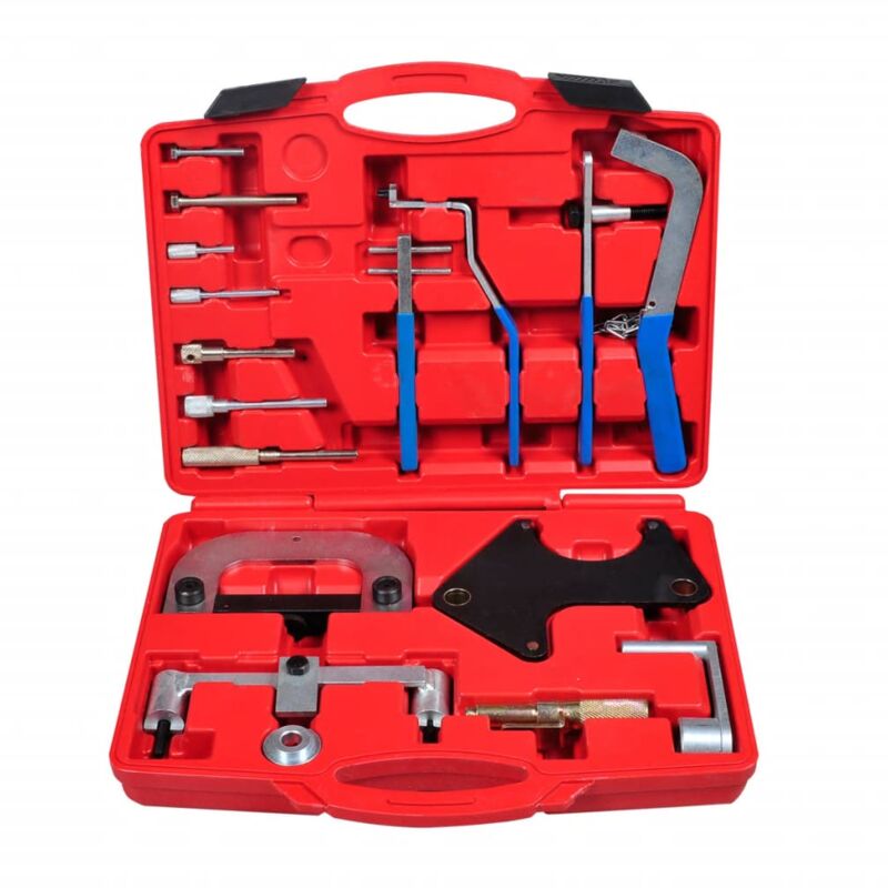 Questo set completo di strumenti di fasatura del motore di oltre venti strumenti consente di effettuare la fasatura corretta del motore durante la sostituzione della cinghia di distribuzione. Questo set adatto per l'uso sulle auto pi diffuse con motori a benzina o diesel. Adatto ai seguenti motori a benzina - 1.2 (codice motore D7F) ad es. Clio e Twingo - 1.2 / 1.4 / 1.6 (codice motore E5 E7F, E7J, K7M) ad es. Clio, Megane, Scenic, Kangoo - 1.4 / 1.6 16V (codice motore K4J, K4M dal 1998) ad es. Clio, Clio Sport, Megane, Scenic, Laguna, Espace - 1.7 / 1.8 / 2.0 (codice motore F1N - F3N, F3P, F2R - F3R) ad es. Clio, Megane, Scenico - 1.8 / 2.0 16V (codice motore F4P, F4R dal 1998) ad es. Clio, Clio Sport, Megane, Scenic, Laguna, Espace - 1.8 / 2.0 16V (codice motore F7P, F7R) ad es. Clio Williams, Megane, Spider, R19 - 2.0 / 2.2 (codice motore J5R - J7R, J5T) ad es. Safrane, Espace, Master, Traffic - 2.0 16V / 2.5 20V (codice motore N7Q, N7U) ad es. Laguna e Safrane e motori Volvo