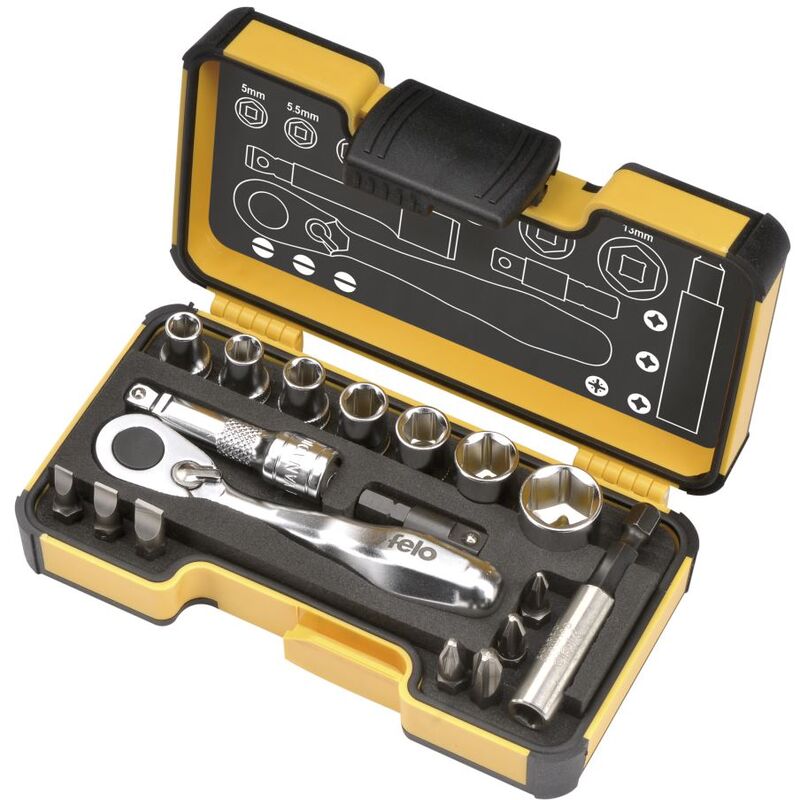 Set di strumenti 1/4 con miniratsche xs 18 pollici (18 -pc./ 18 -PCE) 1 x mini -ratchet/minir tochet 1/4 7 x inserti a chiave/prese 3/16 -7/32 -1/4 - 9/32 - 5/16 - 3/8 - 1/2 7 x bit (C6.3 x 25mm) 4,5 x 0,6/ 5,5 x1,0/ 6,5 x 1,2/ ph2/ ph3/ sq2 1 x estensione (50mm (50mm ) 1/4 - 1/4 1 x Adattatore C 6.3 - 1/4 (25mm) 1 X Porta bit/Bithholder E6.3 x 58mm