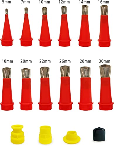 【Puoi ottenere】 La confezione contiene 15 diverse dimensioni di ugelli per calafataggio da 5 mm, 6 mm, 7 mm, 9 mm, 10 mm, 12 mm, 14 mm, 16 mm, 18 mm, 20 mm, 22 mm, 25 mm, 28 mm, 30 mm e 35 mm, con 6 basi di connessione