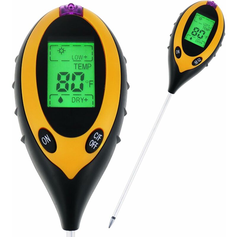 Tester del terreno 4 in 1, ottimo strumento per riparare il tuo prato quando l'erba non cresce in determinate aree del tuo giardino Misura la luce solare (9 livelli), l'umidità del suolo (5 livelli), il pH del suolo (12 livelli) e la temperatura Sonda lunga 200 mm con spegnimento automatico e retroilluminazione Indagine sull'intensità della luce dell'ambiente attuale Misurazioni rapide e precise e alta precisione