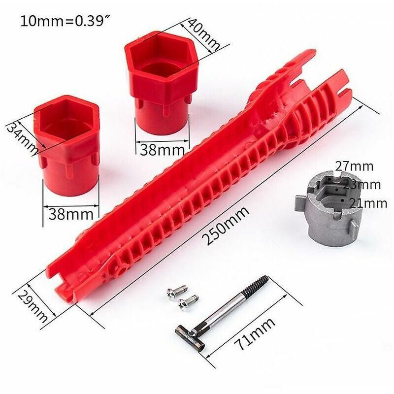 Nome del prodotto: chiave per tubi dell'acqua Dimensioni: 256 mm Ambito di applicazione: dadi e dadi ad angolo 2/3/4/6 Peso: 260 g Quantità per confezione: 1 set di 7 parti Il colore rosso Materiale: lega Materiale Il rubinetto l'installatore del lavello è forgiato in rame di alta qualità e tecnopolimero ABS, che è robusto e durevole, non si deforma facilmente e il design antiscivolo consente di allentare facilmente la forza della mano. Serrare i dadi di montaggio difficili da raggiungere su rubinetto, spruzzatore e valvola a sfera. Adatto per l'uso in spazi ristretti e facile da girare Il design scanalato di facile utilizzo consente un facile accesso alle linee di servizio esistenti e la testa della chiave può essere rimossa con semplici regolazioni. L'indicatore di livello può essere tarato nel tempo durante la sospensione e l'installazione. Dimensioni e confezione La dimensione complessiva è di 26 cm * 5 cm * 3 cm. La confezione include 1 installatore di rubinetti e lavandini, 2
