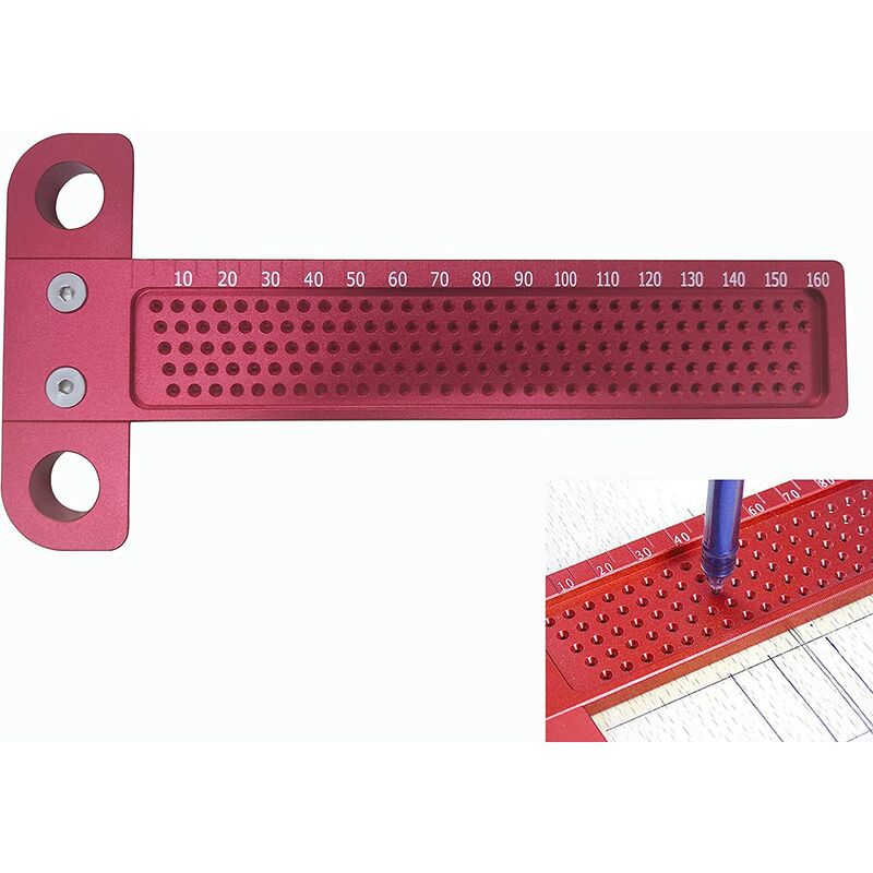 Funzione: utilizzata per disegnare le dimensioni e la lunghezza richieste, scanalare, posizionare, giuntare, intarsiare, ecc. su legno. Modalità d'uso: ogni foro rappresenta un millimetro e la distanza tra i due fori è di 5 mm. Trova il foro corrispondente sulla scala, inserisci la penna nel foro e sposta il righello per tracciare la linea desiderata Adatto per: lavorazione del legno, costruzione, decorazione, modifica del legno, ecc.
