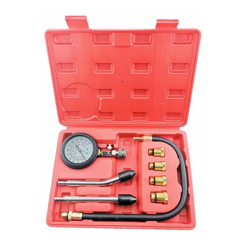 Peso del prodotto: 880G (Imballaggio incluso Dimensione del prodotto: 27x20x5cm Come usare: 1. Avviare il motore e ruotarlo alla normale temperatura di funzionamento, spegnere il motore e attendere che il motore si fermi, quindi rimuovere tutti i tappi di accensione. 2. Aprire completamente la farfalla dell'acceleratore e premere completamente la testa di connessione del manometro sul foro della candela. 3. Utilizzare il motore per ruotare il motore a una velocità di 100-150R / min per 3-5 secondi, il puntatore sullo strumento salirà gradualmente, si fermerà quando raggiungerà un determinato valore, E il valore indicato in questo momento è la pressione di compressione del cilindro. 4. Premere il tasto una volta per restituire il puntatore a zero. 5. Ripeti il misurato 2-3 volte seguendo i passaggi sopra per migliorare l'accuratezza della misurazione. 6. Pressione generale dei cilindri dell'auto> 0,9 MPa e