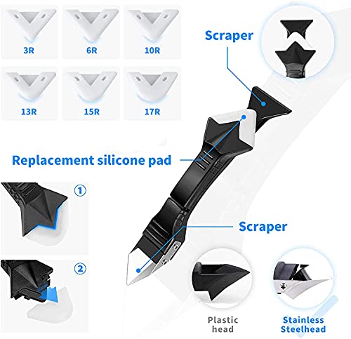 Strumento per presellatura 3 in 1 Tre modalità di raschietto, raschietto in acciaio inox per rimuovere la vecchia colla testarda, spatola in silicone per rimuovere urti e ammaccature superficiali, cuscinetti in silicone bianco per levigare la linea di tenuta e l'angolo.
