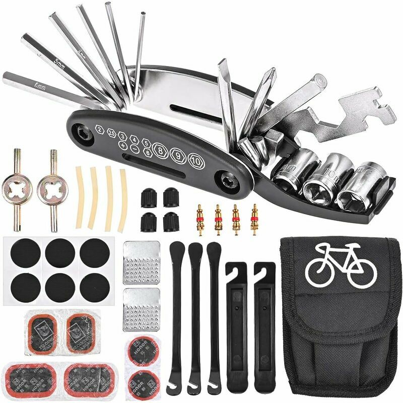 Strumento di riparazione per bici 16 in 1 Strumenti per bici pieghevoli multifunzionali Kit di attrezzi multiuso per bici portatile Kit di riparazione per bici in acciaio inossidabile di alta qualità Kit di riparazione per bici 16 in 1: Chiave esagonale 2 / 2.5 / 3/4/5 / 6 mm Chiave a bussola 8/9/10 / mm Chiave fresca 8/10/15 mm Chiave a raggi 14GE< br/>Prolunga a bussola Cacciavite a testa piatta Cacciavite Phillips Il set include: 1 x 16-in-1 strumento riparazione bicicletta multifunzionale 1 x kit di riparazione (3 leve per pneumatici + 2 leve per pneumatici + 12 toppe autoadesive per pneumatici + 2 mini raspe in metallo) 2 x chiave per stelo valvola 4 x stelo valvola 4 x tappo valvola 4 x elastici 1 custodia nera