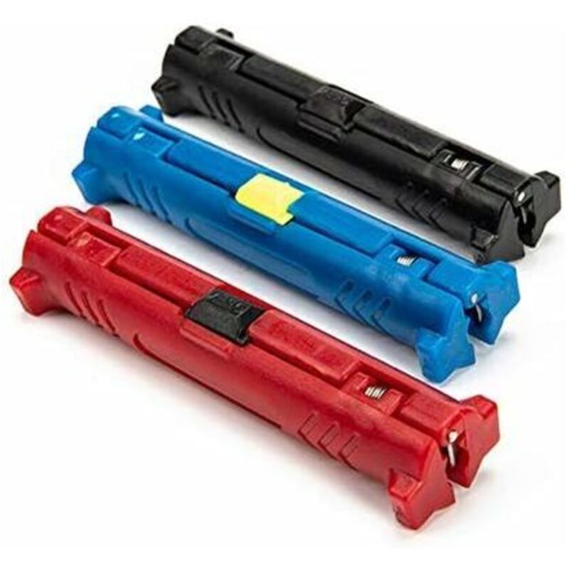 Realizzato in plastica con meccanismo a molla in metallo. Materiale manico: ABS resistente Dimensioni: circa 98 x 25 mm. Taglia piccola. leggero. Facile da trasportare Strumento di apertura o chiusura serratura, blocco di sicurezza Strumento ideale per spellare e piegare cavi coassiali o altri cavi tondi fino a 8 mm di diametro. Migliora la tua produttività Ideale per spelare cavi coassiali, funziona con spine di tipo F, coassiali, BNC, ecc.