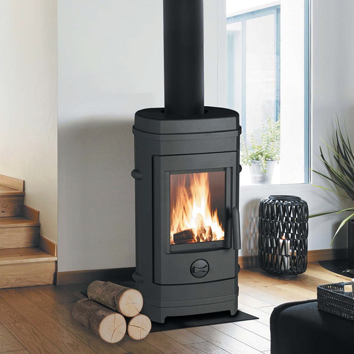 Potenza termica nominale 7 kW. Indicata per scaldare ambienti fino a 74 m². Combustione regolabile. La regolazione dell'aria primaria consente di variare la produzione di calore secondo necessità. Il raccoglicenere estraibile facilita la pulizia anche quando la stufa è accesa. Vetro autopulente che non necessita di soventi pulizie garantendo una continua visione della fiamma