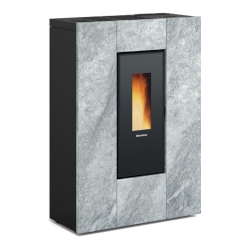 Stufa a pellet canalizzata, slim. Volume riscaldabile 230 Metri cubi Potenza Nominale Stufa 8 Kilowatt Capacità totale serbatoio 15 Kilogrammi Rendimento stufa 92 Percento Consumo orario 1,3 Kilogrammi Ora Tipo di Riscaldamento Ventilazione forzata con possibilità di canalizzazione Diametro scarico fumi 8 Centimetri Classe energetica A+ (2021) Certificazione Ambientale DM186 5 stelle Linea MARILENA PLUS AD Colore Pietra naturale Dimensioni (LxAxP) 75 x 107,7 x 35,2 cm Peso netto 155Kg