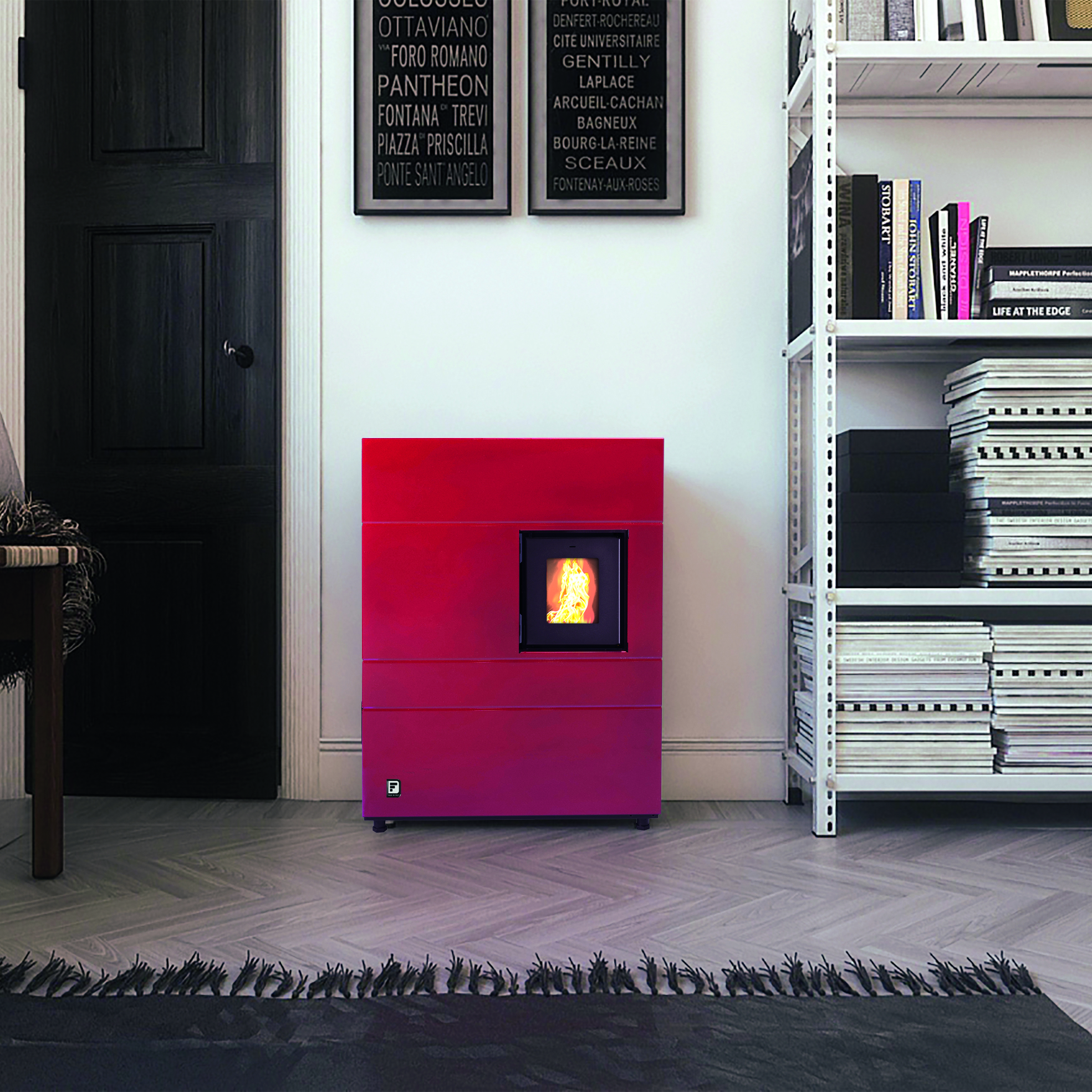 Stufa di dimensioni contenute. Adatta ad ambienti anche non molto spaziosi. Macchina di costruzione e componentistica totalmente italiana.. Di grande funzionalità e design.. Può essere installata a terra o sospesa a muro (optional).