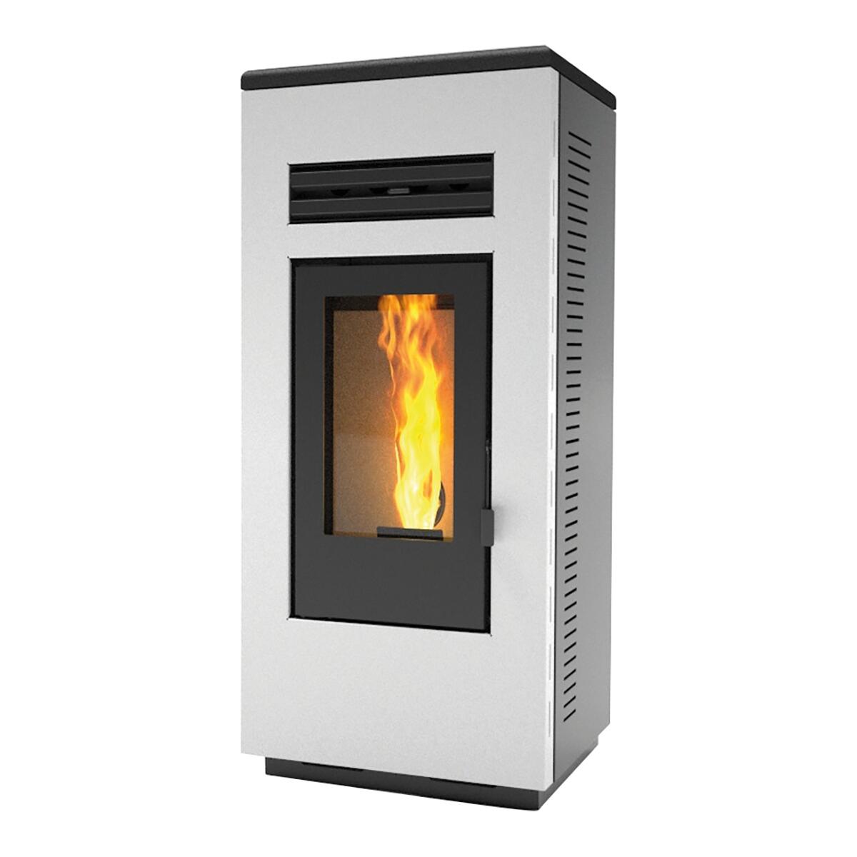 Stufa a pellet luna 10kw bianco. Corpo macchina realizzato con materiali di alto spessore. Gguarnizione porta in acciaio di fibra di vetro / Top in ghisa ad alto spessore. Camera combustione in vermiculite