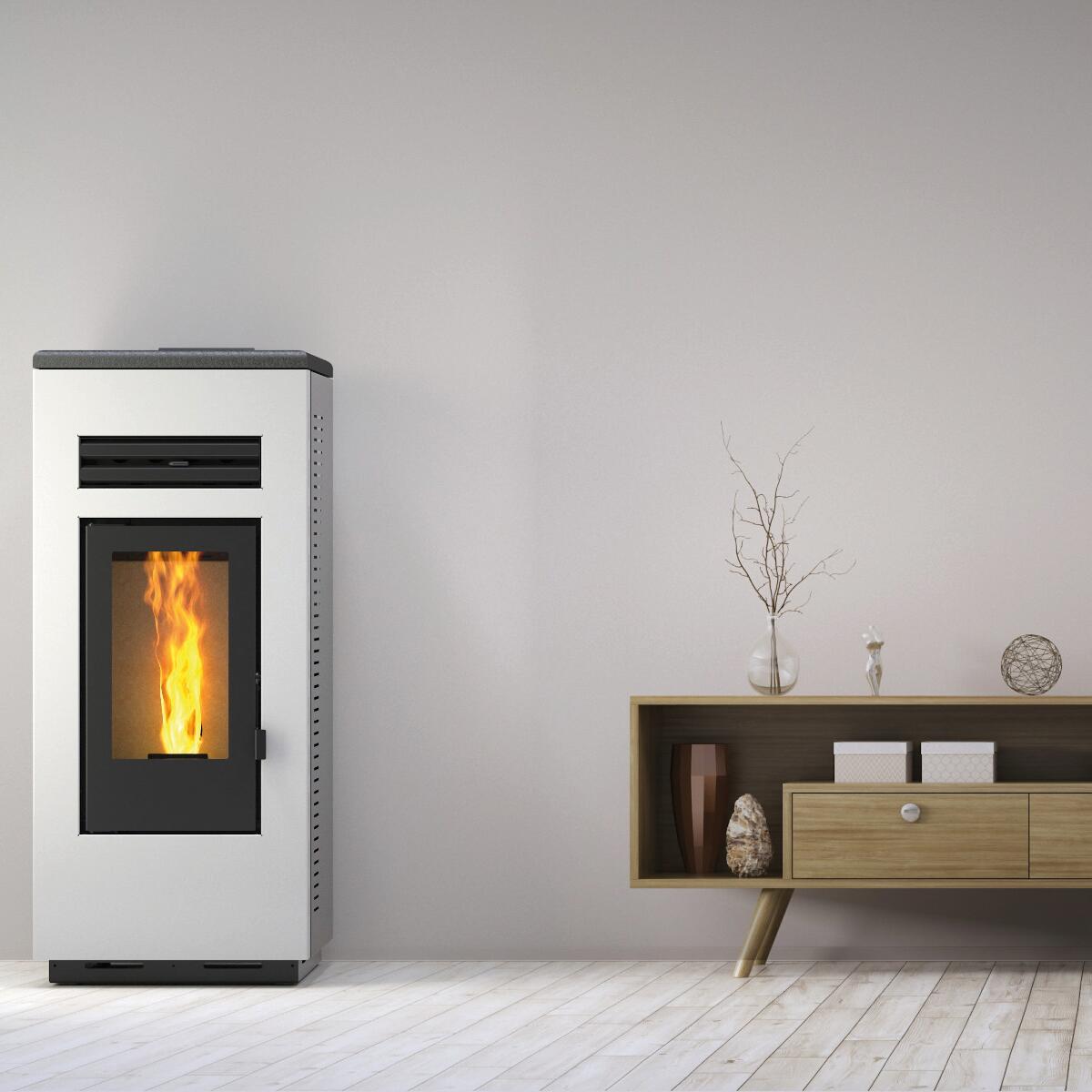 Stufa a pellet luna 12kw bianco. Corpo macchina realizzato con materiali di alto spessore. Gguarnizione porta in acciaio di fibra di vetro / Top in ghisa ad alto spessore. Camera combustione in vermiculite