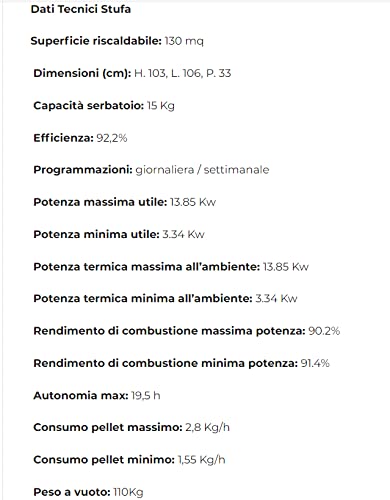 5 livelli di potenza, 5 velocità di ventilazione, programmabile con 3 accensioni e spegnimenti giornalieri, Rumorosità: EN 15036-1: 34dB